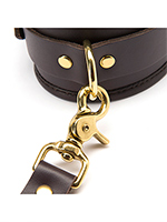 - Прочный кожаный соединитель надежно фиксируется с помощью карабинов на D‑образные кольца на наручниках.