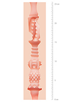 - Размеры корпуса 25,5×7,5 см, глубина погружения ~22,5 см, диаметр канала 1‑3 см (хорошо растягивается и обхватывает член).
