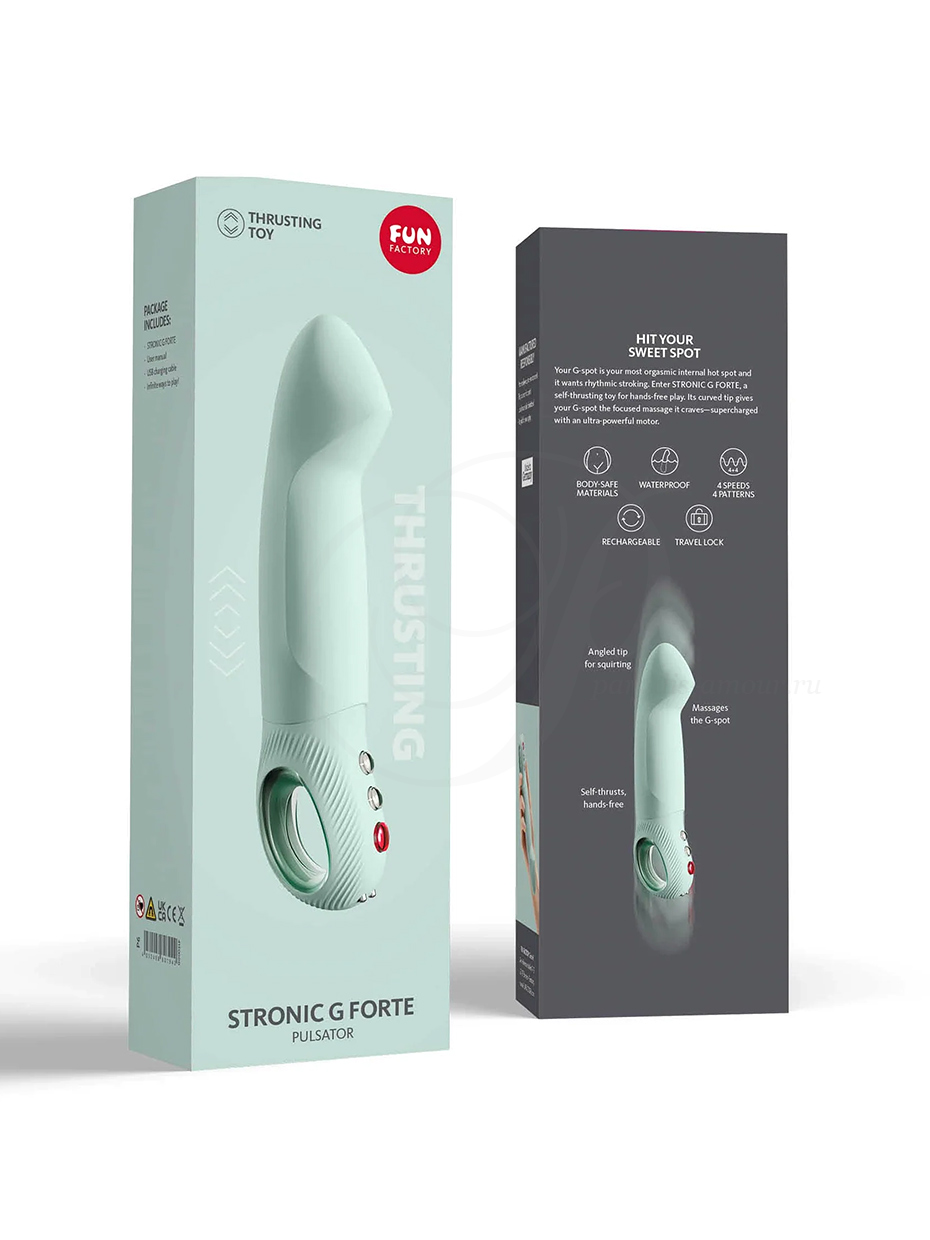 Бесконечно приятный мятный силиконовый красавец Stronic G Forte буквально насквозь пропитан удовольствием. Его массивная головка мощными и ритмичными толчками воздействует на точку G, обеспечивая идеальный для нее характер стимуляции. Удобное управление, высочайшего качества силикон, немецкая надежность и всё остальное, к чему мы привыкли, когда речь заходит о Fun Factory, конечно же, тоже прилагаются.