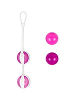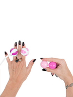 - Шарики выполнены из глянцевого пластика разного оттенка. Внутри каждого шарика находится еще один шарик поменьше («грузик»), который покрыт силиконовой оболочкой для смягчения звука. При движении внутренний шарик перекатывается, соударяясь со стенками внешнего шарика («эффект смещенного центра») — это делает процесс тренировки более приятным и эффективным.