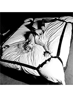 - Суперпрочные нейлоновые ремни натягиваются на углы матраца и фиксируются под ним. В ремни вшиты 8 металлических D‑образных колец, к которым крепятся карабины наручников и наножников. Ширина ремней 5 см.