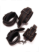 - Наручники и наножники выполнены из высококачественной искусственной кожи. С внутренней стороны подшиты синтетическим материалом для максимального комфорта. Декорированы стильной оранжевой строчкой.