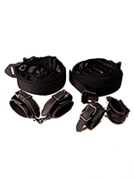 - Набор состоит из двух длинных регулируемых ремней для фиксации на кровать, пары наручников и пары наножников.