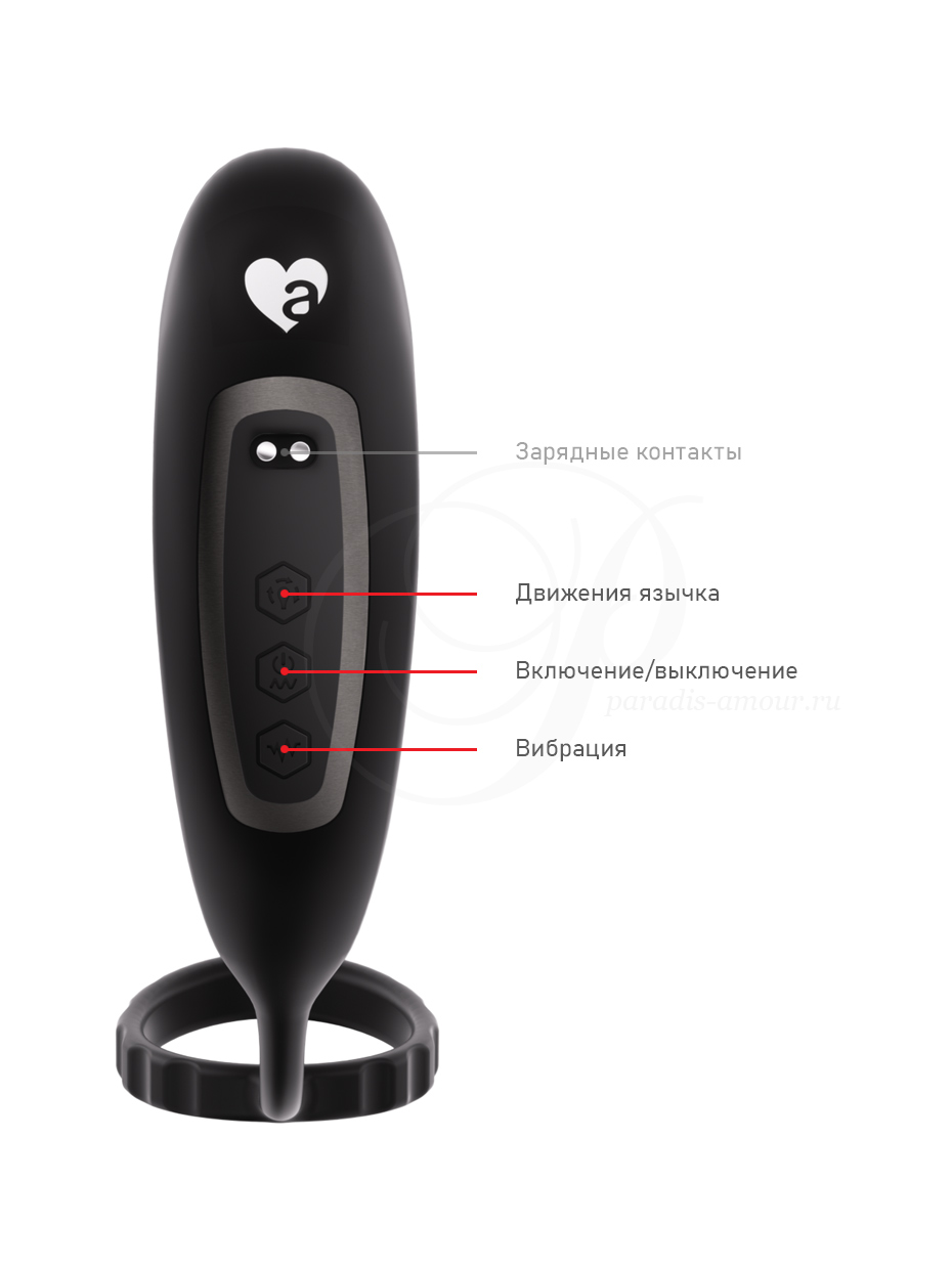 10 режимов движения язычка + 10 паттернов вибрации. Управляется кнопками на поверхности или с пульта. - Эластичное кольцо на пенис усиливает эрекцию и замедляет эякуляцию (надевается в основание члена до или после мошонки).