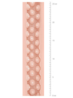 - Канал средней ширины (16‑18 мм) практически полностью покрыт волнующими бугорками и обеспечивает интенсивную стимуляцию члена по всей длине. 69 бугорков расположены 23 кольцами по 3 бугорка в каждом.