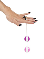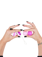 - Шарики выполнены из глянцевого пластика разного оттенка. Внутри каждого шарика находится еще один шарик поменьше («грузик»), который покрыт силиконовой оболочкой для смягчения звука. При движении внутренний шарик перекатывается, соударяясь со стенками внешнего шарика («эффект смещенного центра») — это делает процесс тренировки более приятным и эффективным.
