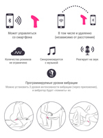 - Может использоваться и без приложения, в этом случае управление осуществляется единственной кнопкой на поверхности (последовательно переключаются 3 уровня интенсивности постоянной вибрации + одна программа пульсирующих вибраций).