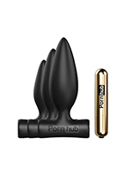 - В набор входит вибропуля Pornhub Bullet и три насадки — анальных пробки разного размера. Пулю можно вставить в основание любой из пробок.