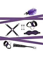 - В набор входят 7 БДСМ и фетиш‑аксессуаров: фиксации на руки и на ноги (наручники + наножники), маска на глаза, плетка-многохвостка, четырехсторонний БДСМ-соединитель («крестовина»), зажимы на соски и перо для поддразнивания.