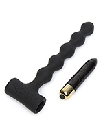 - Комплект из силиконовой насадки в виде анальной цепочки из 5 секций (2,1 см) и миниатюрного вибратора‑пули, который вставляется в основание насадки и превращает ее в анальную вибропробку.