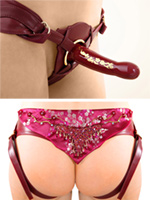 - Крепление для дилдо соединяется с поясом четырьмя ремешками (два под ягодицами между ног и два по бокам), диаметр крепежного кольца ~5 см — совместимо с подавляющим большинством представленных на рынке дилдо с основанием.