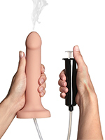 - Дилдо семиреалистичной формы с функцией эякуляции: смазка или другая жидкость подается по трубке с помощью входящего в комплект шприца с поршнем и выбрасывается через отверстие в головке.