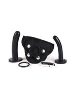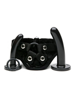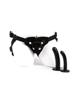 - Комплект состоит из универсального харнесса на ремнях, двух силиконовых дилдо разного размера (Tantus Silk Small и Tantus Silk Medium), микровибратора-пули и дополнительного силиконового кольца для крепления дилдо увеличенных размеров (до 4 см).